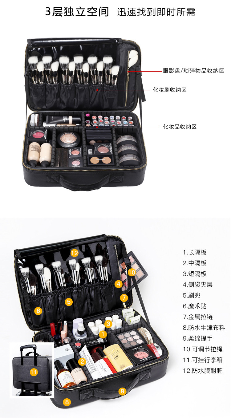 廠家定制專業(yè)化妝包,便攜專業(yè)化妝包,收納包,多層大號化妝師跟妝箱包紋繡包定制,簡約的設(shè)計風(fēng)格,大氣的五金搭配,走線勻稱,內(nèi)部實用,顏色正,質(zhì)感好。