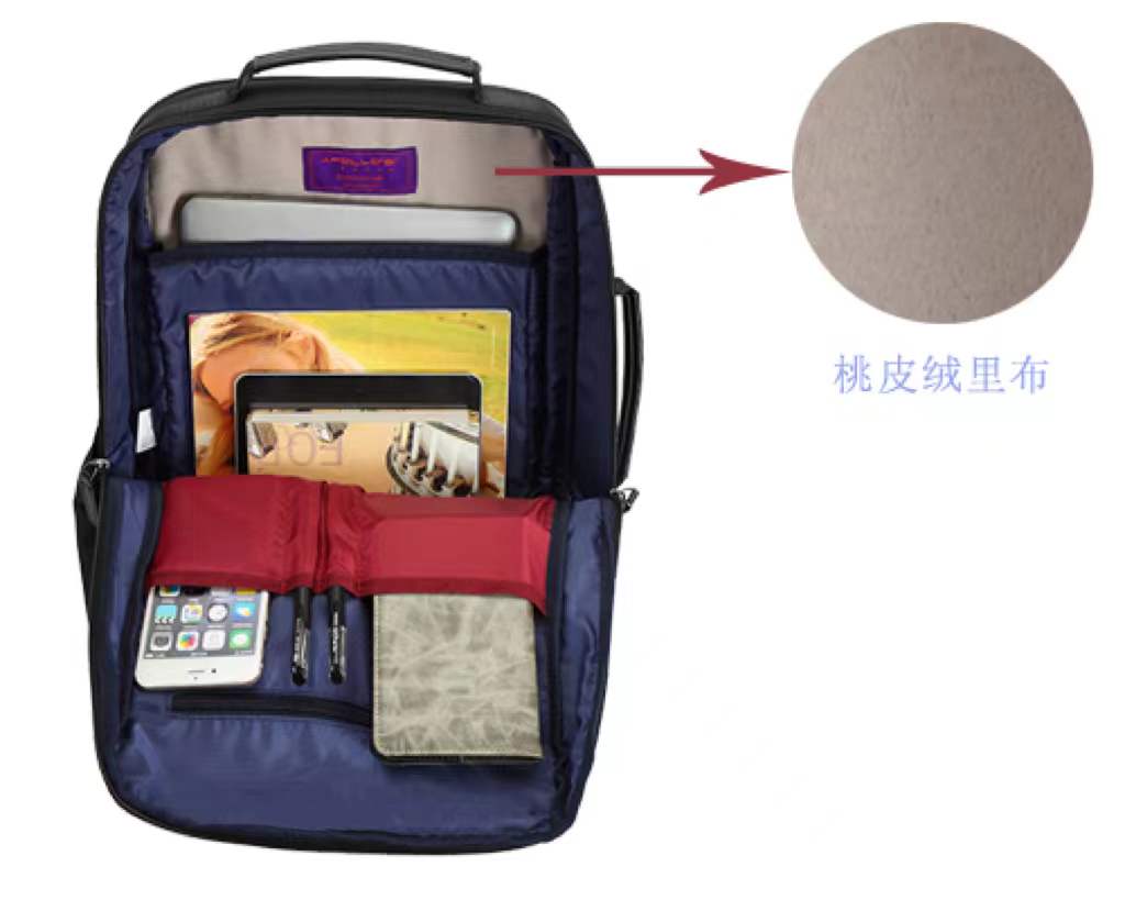 桃皮絨因其絨更短,表面幾乎看不出絨毛而皮膚卻能感知,以至手感和外觀更細(xì)膩而別致。具有吸濕、透氣、防水的功能以及蠶絲般的外觀和風(fēng)格,織物柔軟,富有光澤,手感滑糯的特性。在背包定制時,正是因其材料特性,桃皮絨多數(shù)時候是用來作為背包里布使用,比如說一些內(nèi)膽包、電腦背包等對背包內(nèi)里材料要求比較高的包類產(chǎn)品,就會經(jīng)常使用桃皮絨面料作為里布使用。