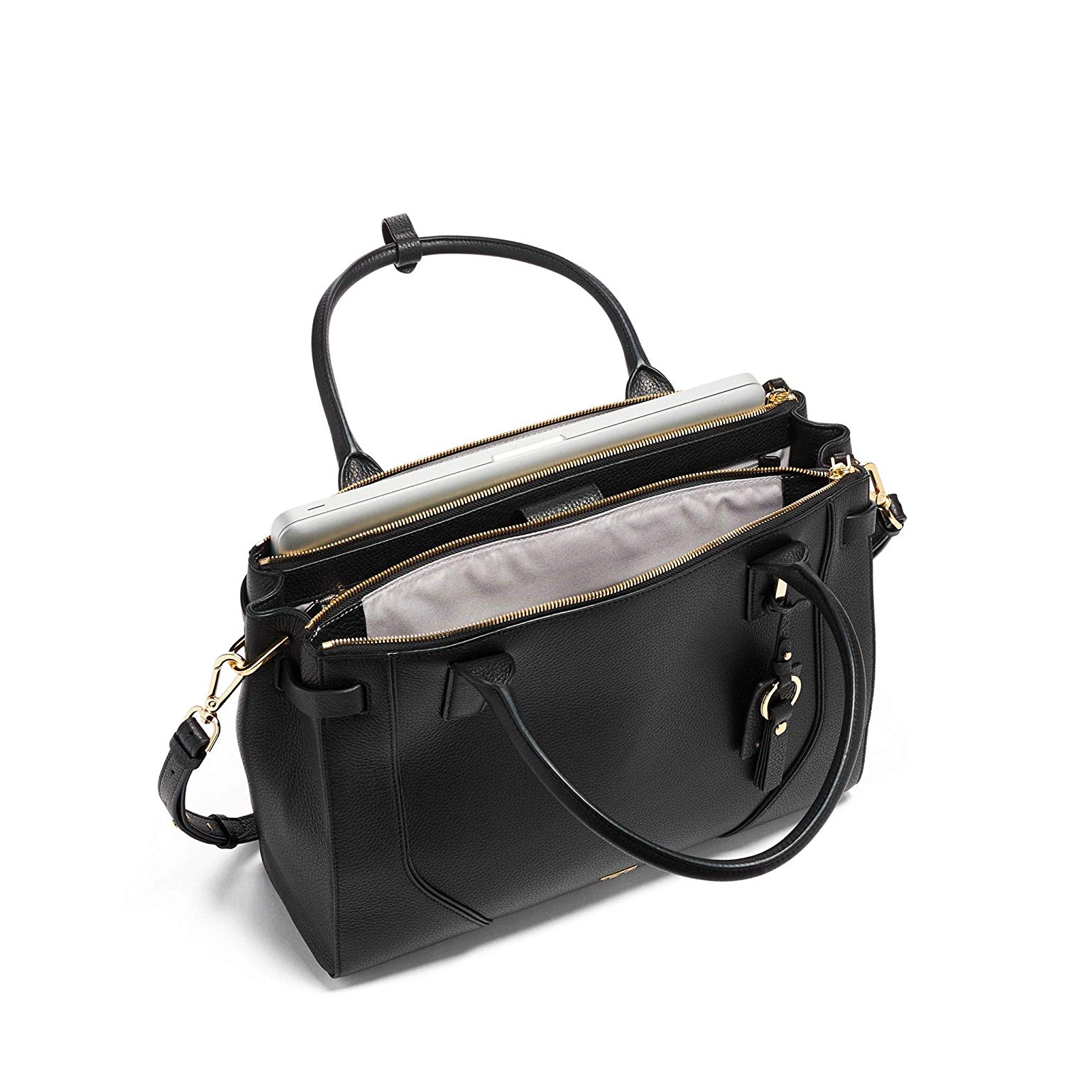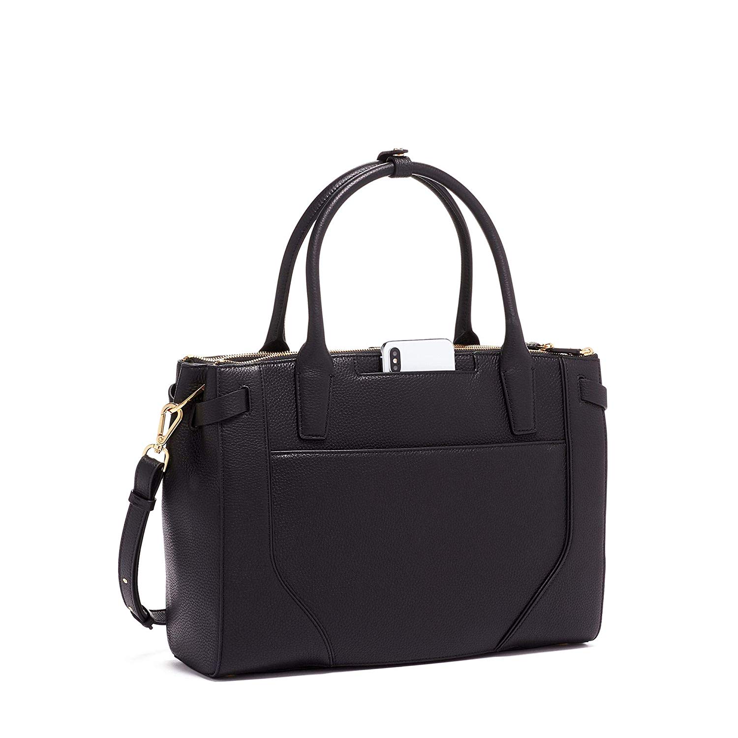 外部特征:磁性按扣開口,中間隔層,拉鏈開口,加墊筆記本電腦隔層(13 英寸),前隔層拉鏈,快速取用手機(jī)袋,磁性按扣,皮革手柄,可拆卸皮革斜挎肩帶,4 金屬腳